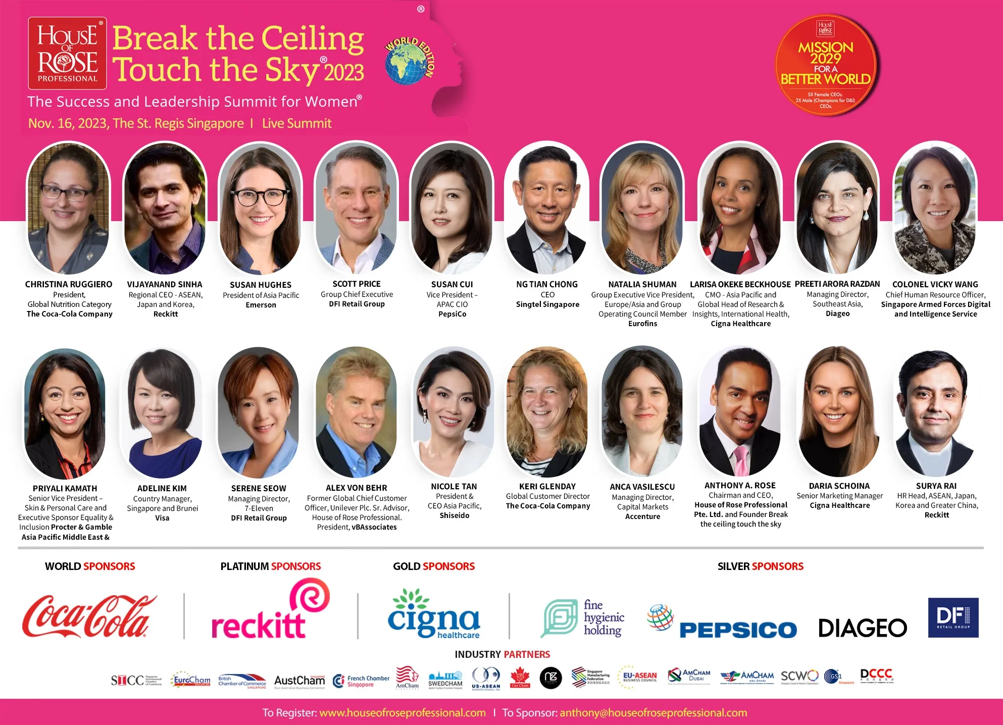 The 2023 World Edition of Break the ceiling touch the sky® – the success and leadership summit for women will be held LIVE in Singapore at The St Regis Singapore on Nov 16, 2023.