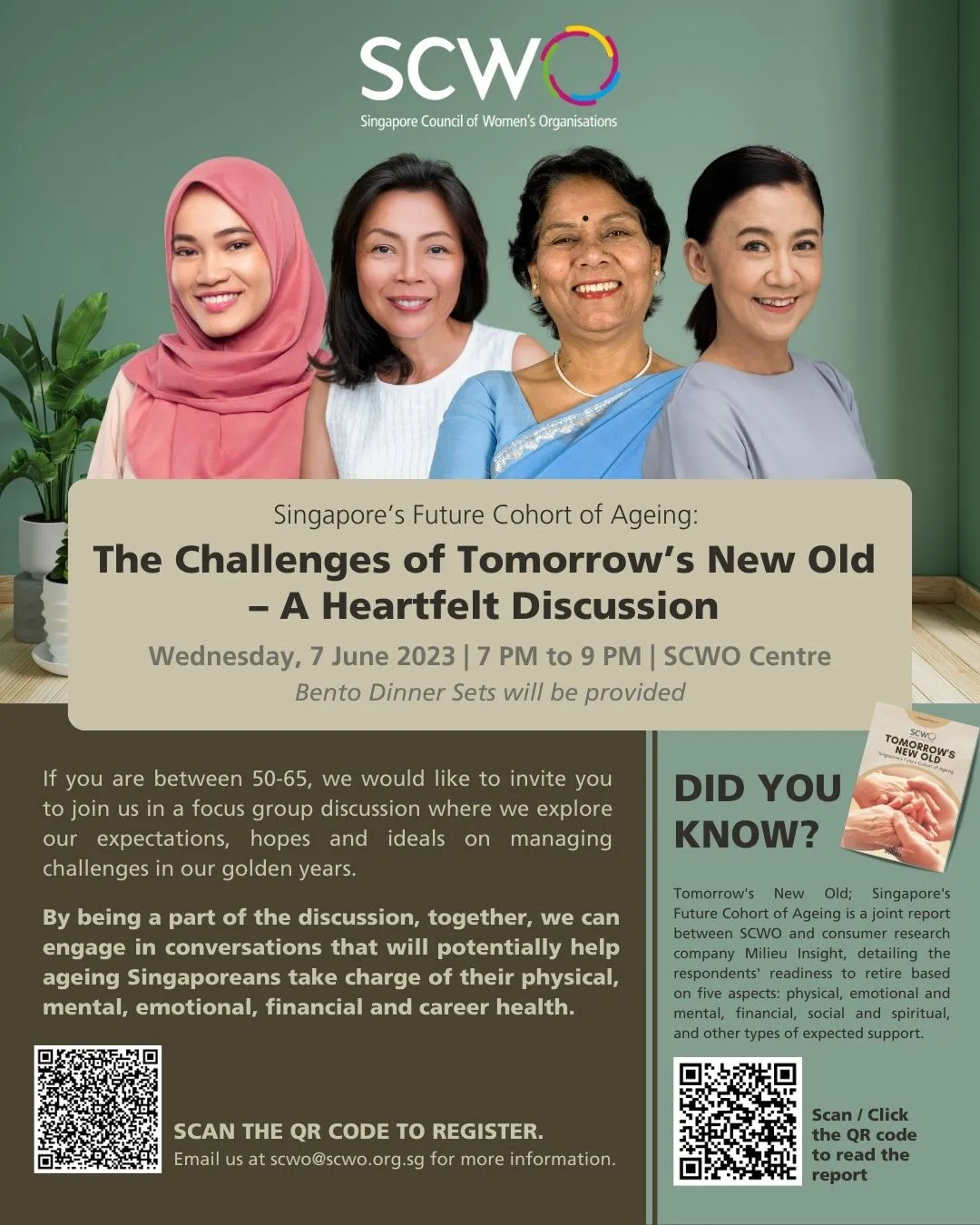 The Singapore Council of Women’s Organizations (SCWO) is organizing a focus group discussion to hear from Singapore’s Future Cohort of Ageing first-hand. Following the research conducted by the Taskforce for Ageing on Tomorrow’s New Old (TNO), we invite Singaporeans/Permanent Residents between the ages of 50-65 years old to join us in a focus group discussion where we further explore your expectations, hopes and ideals on managing challenges in your golden years.