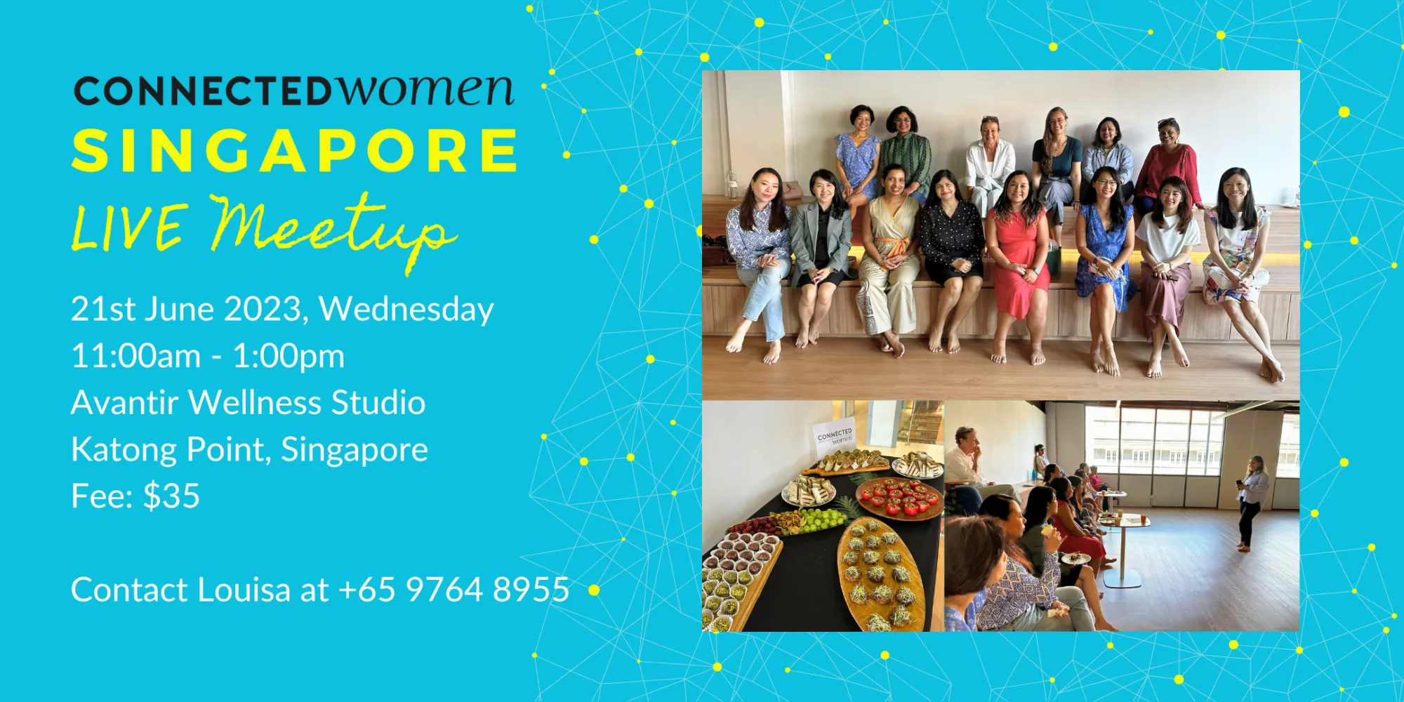 We are a global community for women entrepreneurs, freelancers, and professionals! Join us on the 21st of June 2023, 11:00am – 1:00pm at Avantir Wellness Studio, Katong Point, 451 Joo Chiat Road #02-08/09 S(427664) for a fun, informal meetup and a chance to network with other Connected Women LIVE in person.