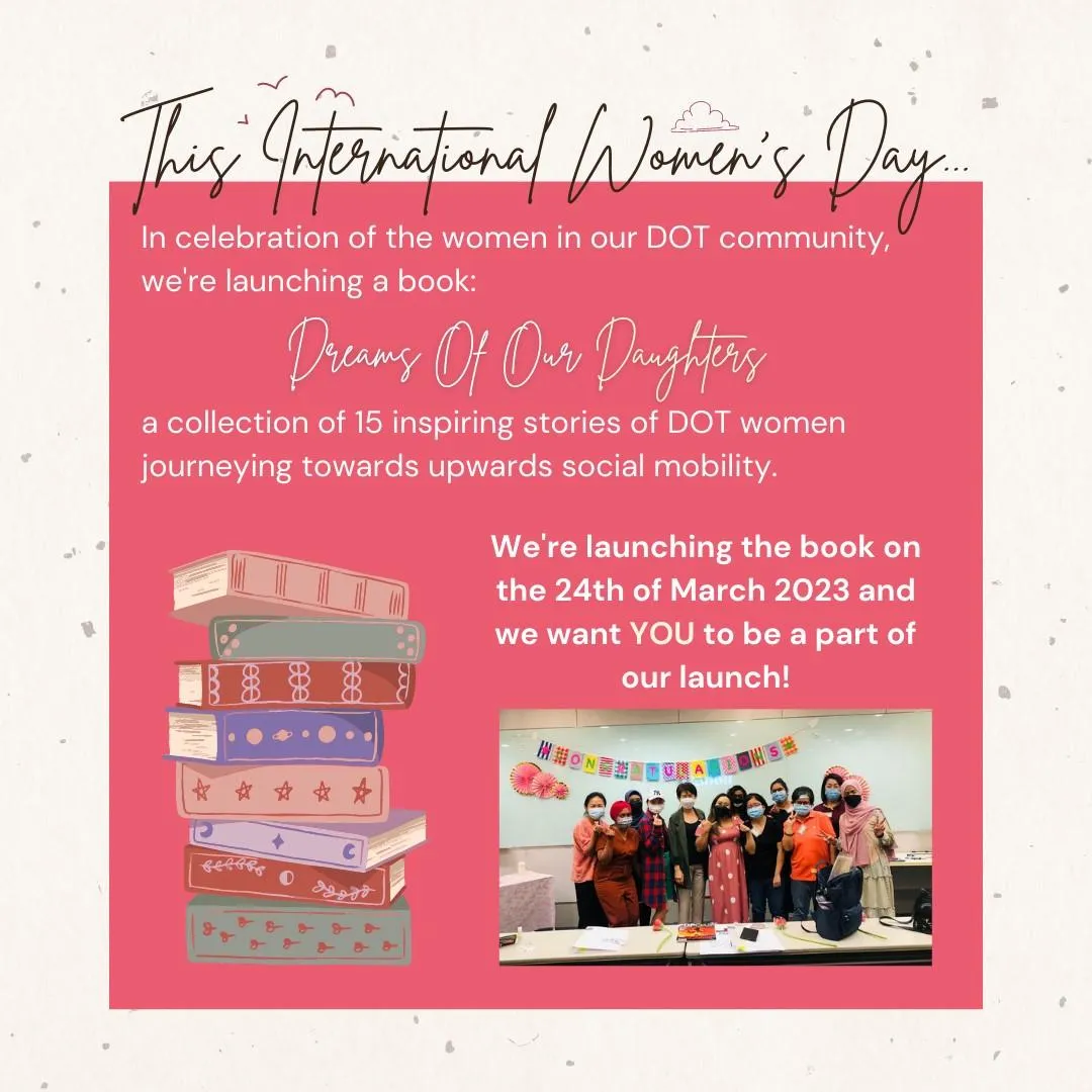 As part of the IWD 2023, DOT will be launching a book “Dreams of Our Daughters” which contains a collection of 15 stories of our DOT women, centering around their journey back to work. The themes revolve around legal issues, challenges in obtaining stable housing and caregiving needs in Singapore, as well as flexible and sustainable employment opportunities.
