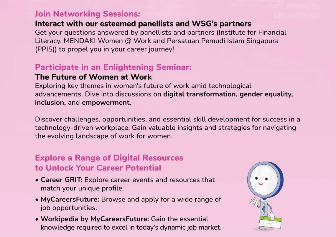 Workforce Singapore (WSG) will be celebrating International Women’s Day on 13 Mar 2024, with the theme of The Future of Women at Work.
