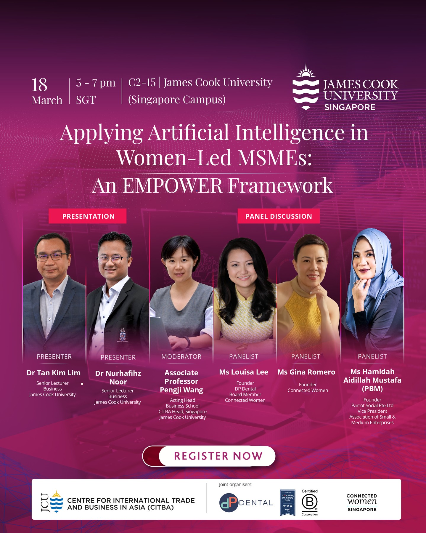 In celebration of International Women’s Day, join James Cook University Singapore and Connected Women, a member of Singapore Council of Women’s Organisations, for the launch of the book Applying AI in Women-Led MSMEs: An EMPOWER Framework.