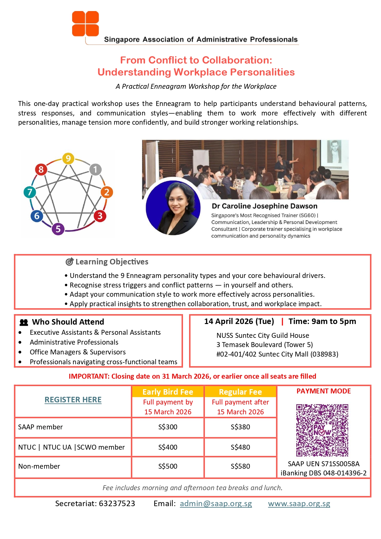 Workplace dynamics can be complex — different personalities, communication styles, and stress responses often shape how teams interact, collaborate, and resolve tension. This one-day practical workshop introduces the Enneagram, a powerful framework that helps individuals understand behavioural patterns and motivations, enabling more effective communication, stronger teamwork, and greater confidence in navigating workplace challenges. Led by Dr Caroline Josephine Dawson, Singapore’s Most Recognised Trainer (SG60), this interactive session provides practical insights into how personality influences leadership, communication, and collaboration. Participants will gain tools to recognise stress triggers, adapt their communication styles, and strengthen trust across diverse teams.