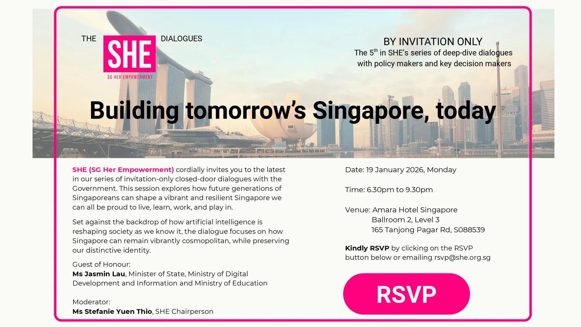 Set against a backdrop of rapid societal and global changes, with Artificial Intelligence’s increasing influence, the next instalment of the SG Her Empowerment (SHE) Dialogue “Building Tomorrow’s Singapore, Today” will take place on 19 January 2026.