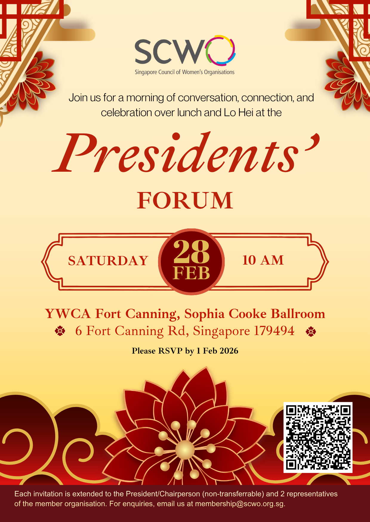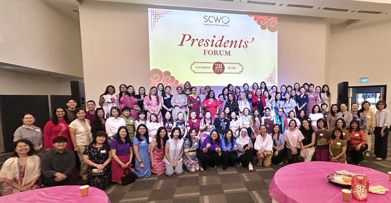 On 28 February 2026, SCWO convened Presidents and representatives at the Sophia Cooke Ballroom at YWCA for this year’s Forum. In her opening address, SCWO President Dr Seow Yian San reflected on 2025 as a year of recalibration, highlighting SCWO’s continued role as a convener and bridge across sectors. Key updates included insights from SCWO’s Mental Health Survey on women in midlife, which surfaced gaps in awareness, access, and stigma, alongside the importance of supportive environments and workplace allyship.
