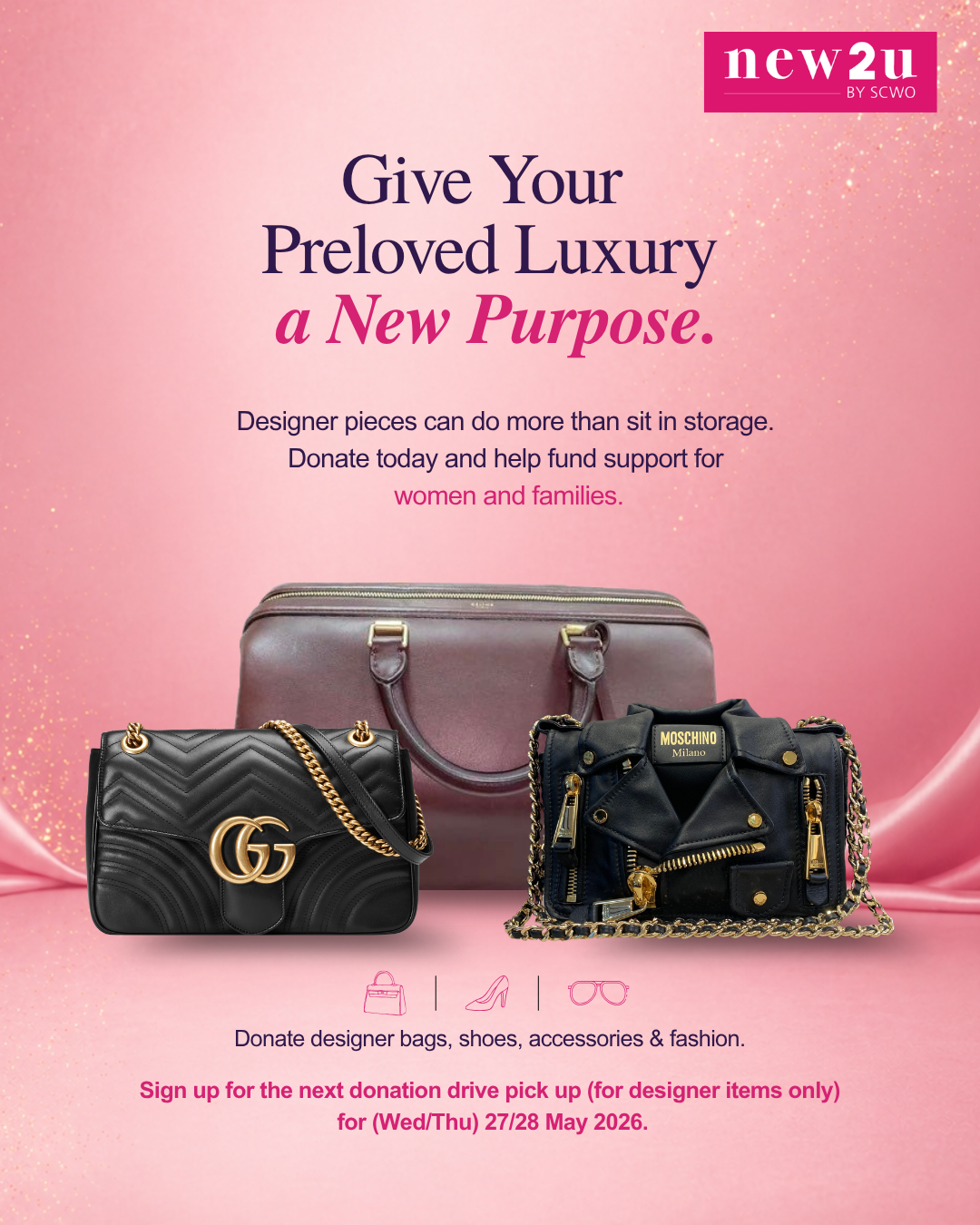 Some things are too good to sit in storage. Your preloved designer bags, shoes, and accessories can do so much more, helping to fund support, stability, and care for women and families across Singapore.