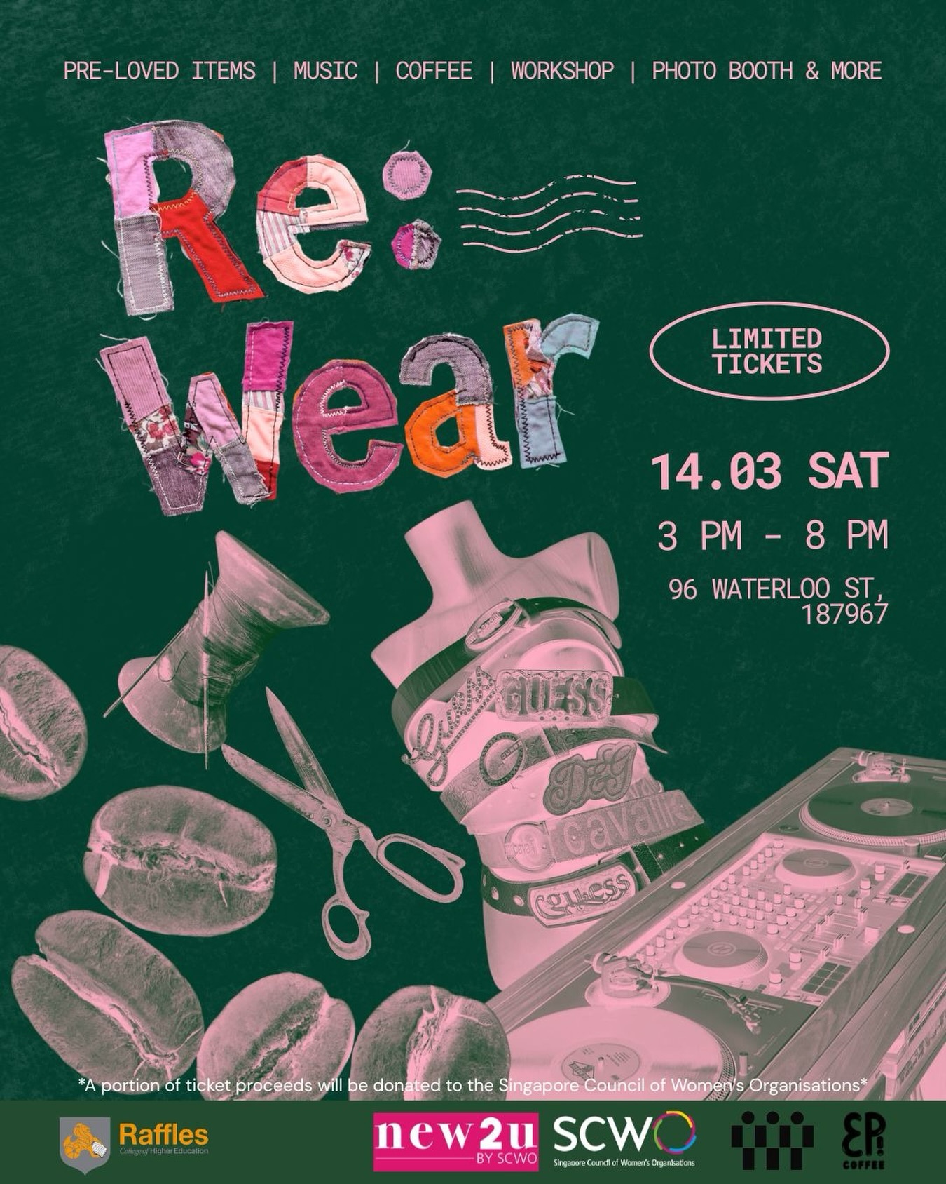 On 14 March, New2U by the Singapore Council of Women’s Organisations (SCWO) will be part of RE:WEAR, a daytime community event where sustainable fashion, music, coffee and creativity come together — all while supporting a good cause.