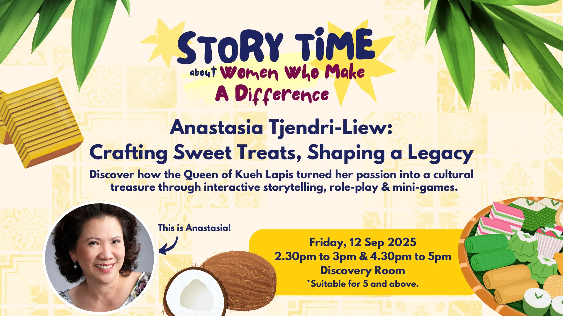 Join us for a special storytelling session at the Children’s Museum Singapore, as we spotlight the inspiring journey of Anastasia Tjendri-Liew, founder of Bengawan Solo and Singapore Women’s Hall of Fame Honouree, and affectionately known as the Queen of Kueh Lapis. Through engaging role-play and interactive mini games, discover the passion, perseverance, and heritage behind her iconic creations.