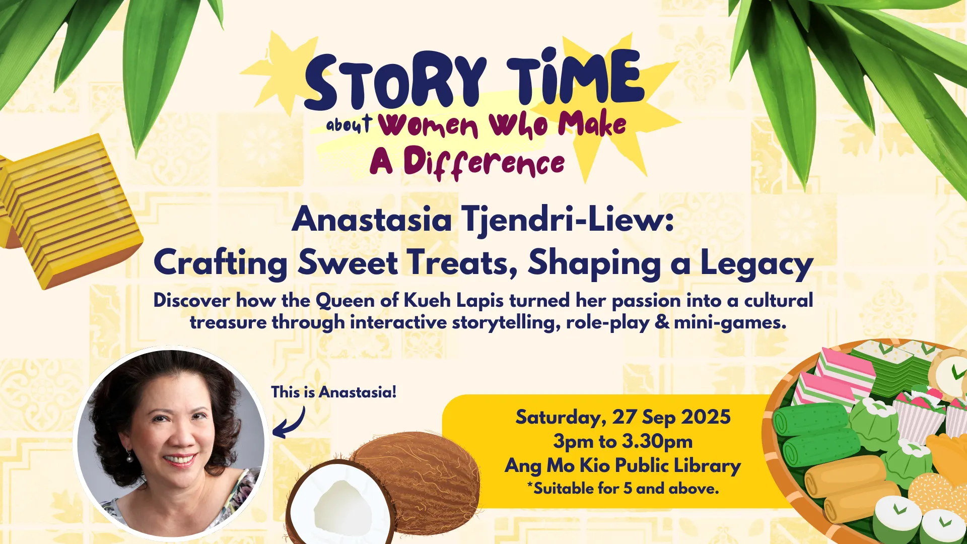 Join us for a special storytelling session at the Children’s Museum Singapore, as we spotlight the inspiring journey of Anastasia Tjendri-Liew, founder of Bengawan Solo and Singapore Women’s Hall of Fame Honouree, and affectionately known as the Queen of Kueh Lapis. Through engaging role-play and interactive mini games, discover the passion, perseverance, and heritage behind her iconic creations.