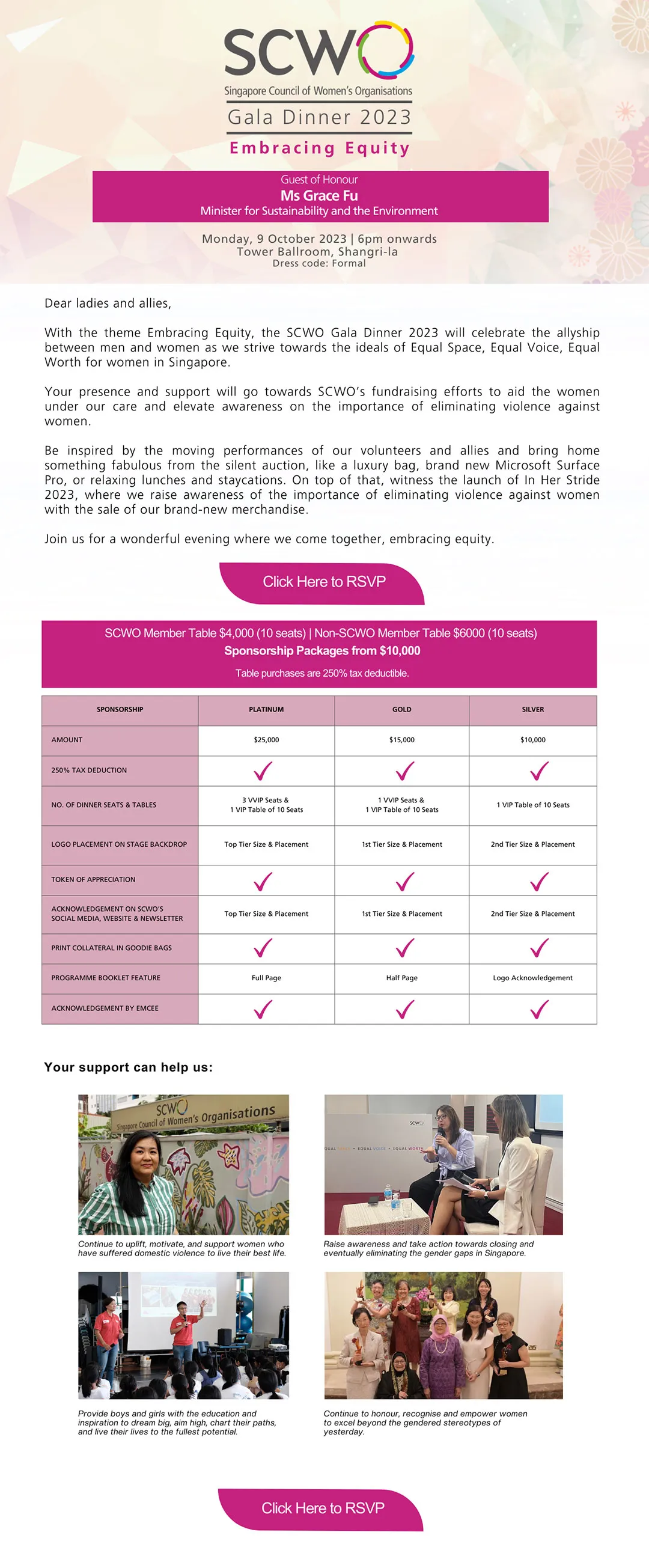 We hope that you will support this meaningful event. Should you require any information or clarification or have suggestions on alternative ways your organisation may collaborate with SCWO for this event, please get in touch with Shahira, at shahira@scwo.org.sg.
