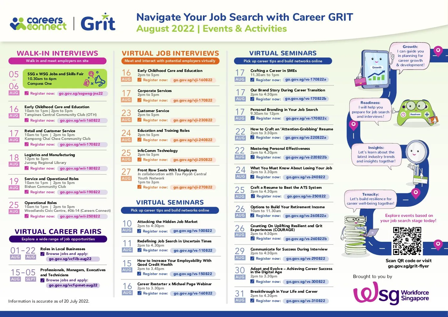This August, WSG has activities ranging from sector-specific job interviews and career fairs, to educational seminars to guide you in the often complex and draining job search process. For more information and to register for these events, visit Go.gov.sg/Grit-SW.