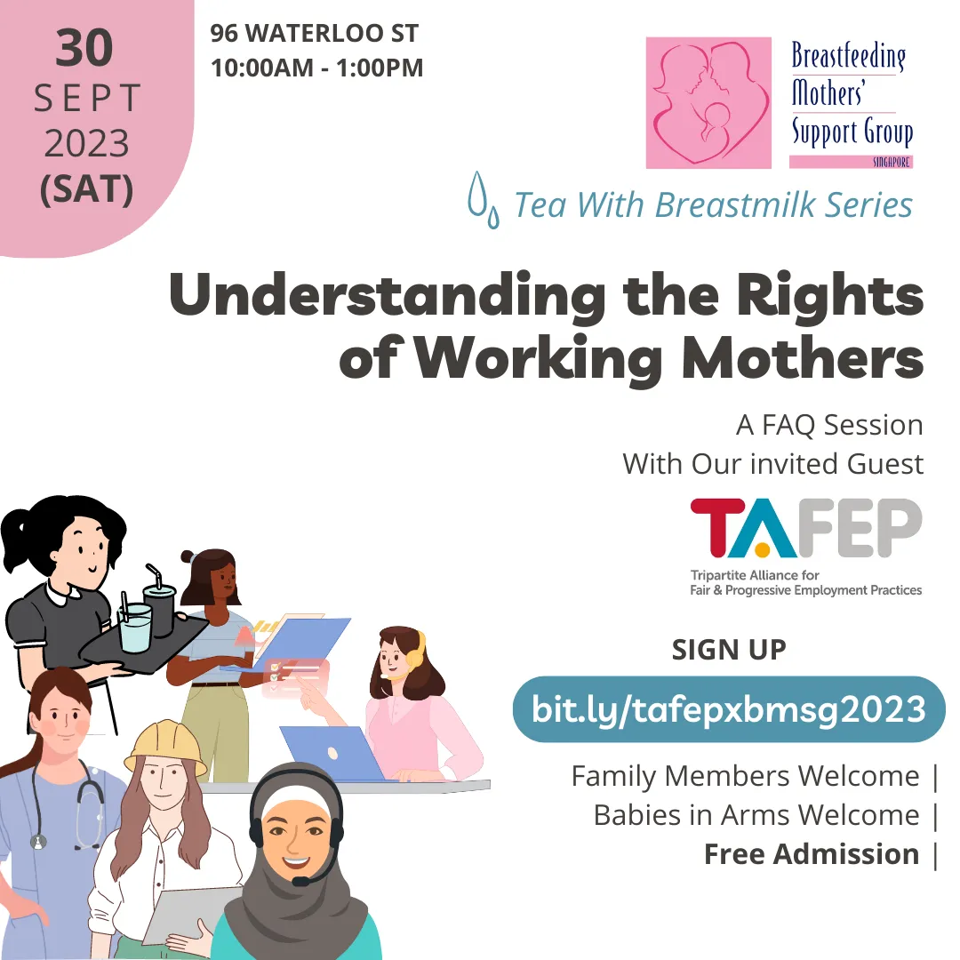 The Breastfeeding Mothers' Support Group (BMSG) in Singapore is hosting an informal discussion with working mothers, and has invited the Tripartite Alliance for Fair and Progressive Employment Practices (TAFEP) to speak at the event.