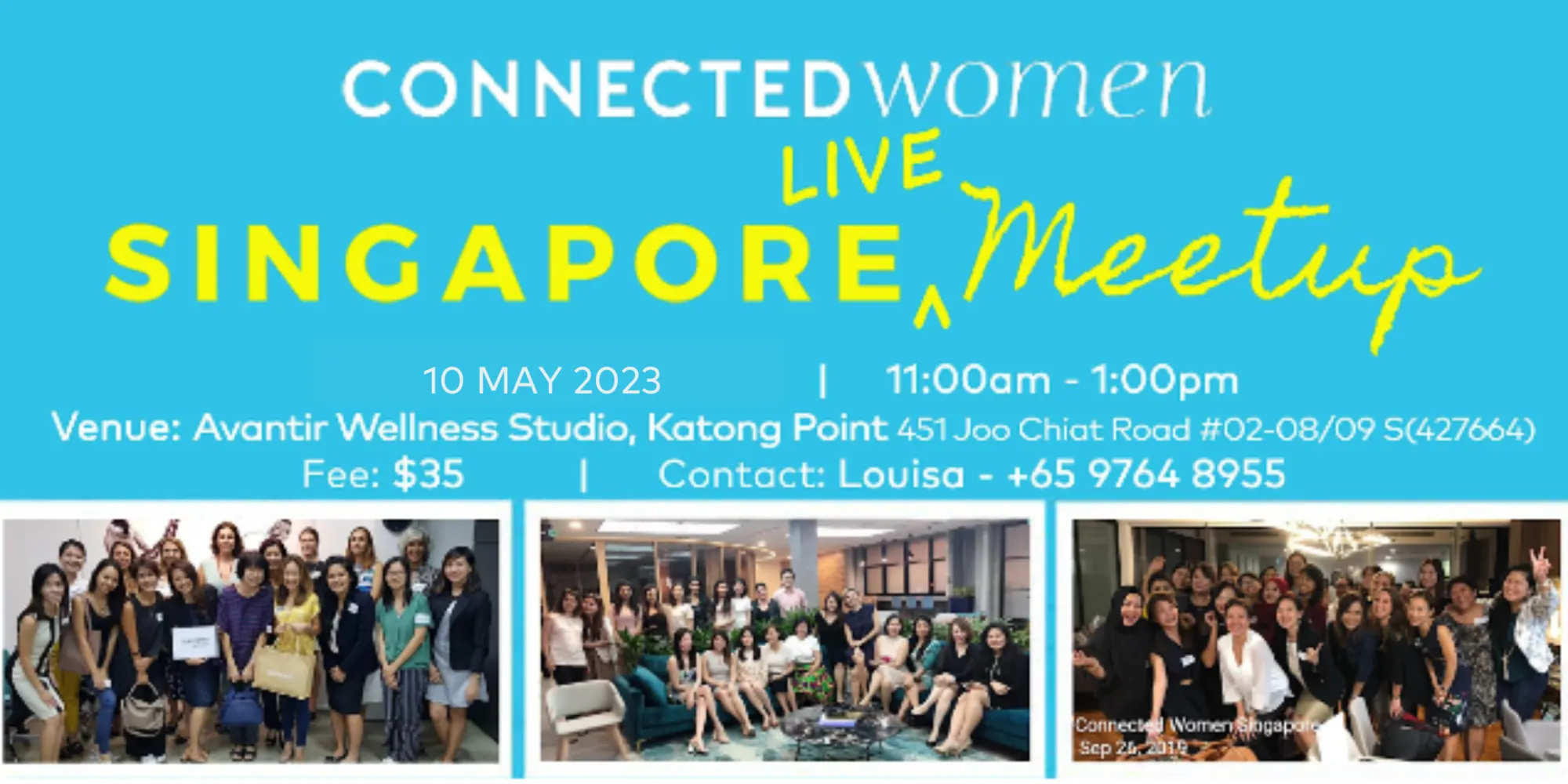 Join us on 10th of May 2023, 11:00am - 1:00pm at Avantir Wellness Studio, Katong Point, 451 Joo Chiat Road #02-08/09 S(427664) for a fun, informal meetup and a chance to network with other Connected Women LIVE in person.