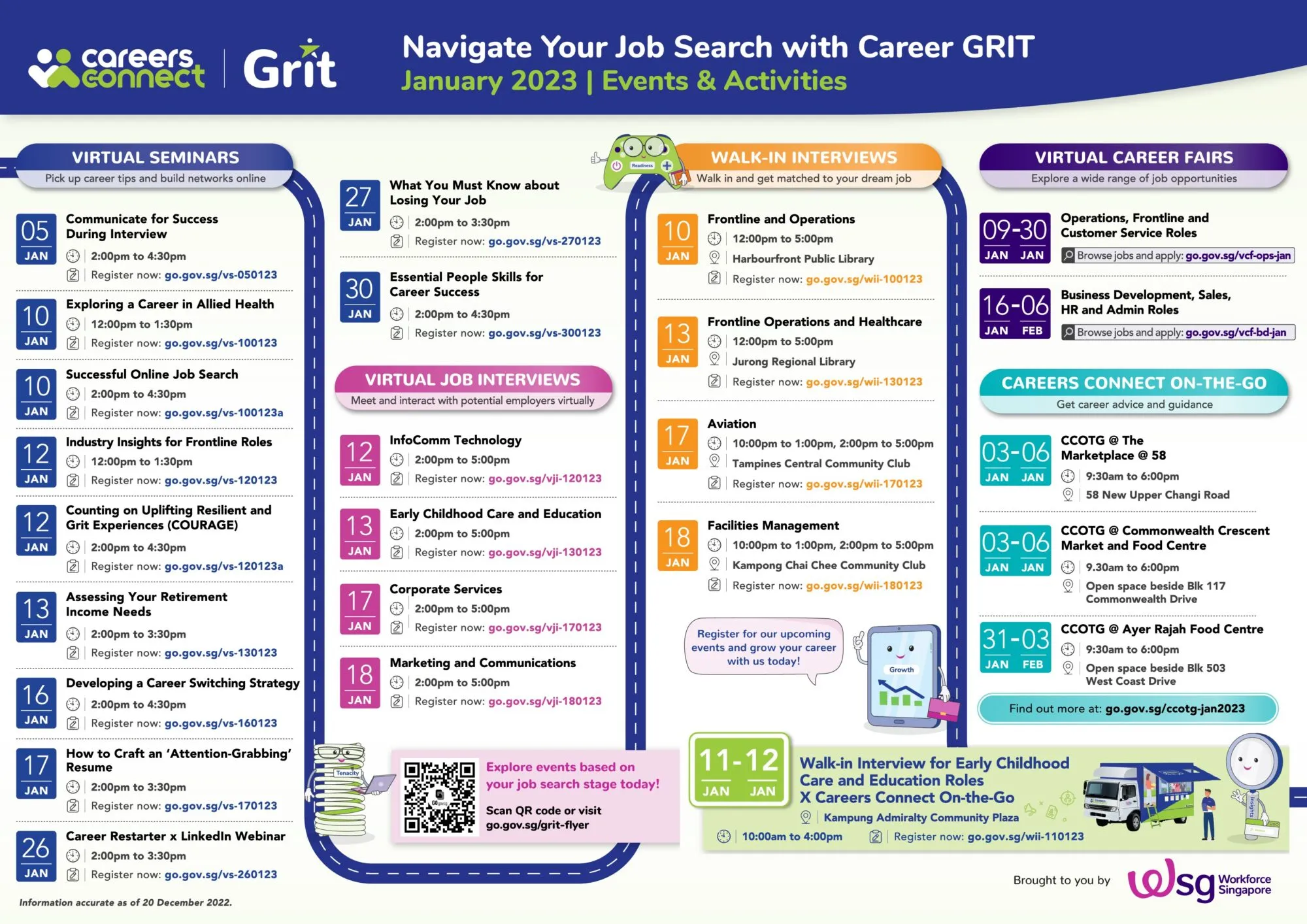 Here are some Career Events by Workforce Singapore that will be available in January 2023. This month’s highlights include: Exploring a Career in Allied Health, 10 Jan (Virtual Seminar) Walk-in Interview for Early Childhood Care and Education Roles, 11 to 12 Jan at Kampung Admiralty Community Plaza Virtual Career Fair for Operations, Frontline and Customer Service Roles, 9 to 30 Jan Residents can register and get information for all these events using Career GRIT (go.gov.sg/grit-sw), especially under the “Career Resources” section.