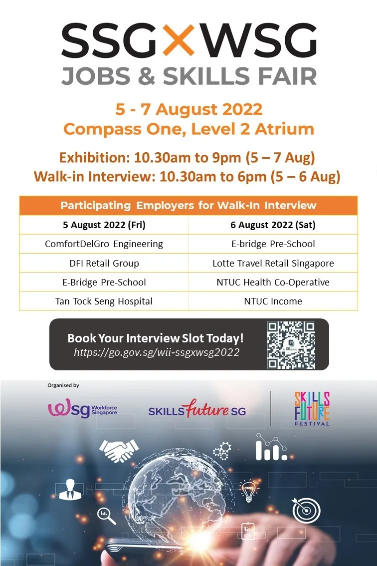 Come down for walk-in interviews with companies from various sectors on 5 to 6 Aug, get career and skills advice from our ambassadors, and explore programmes that can help you with your training and employment journey. See you there!