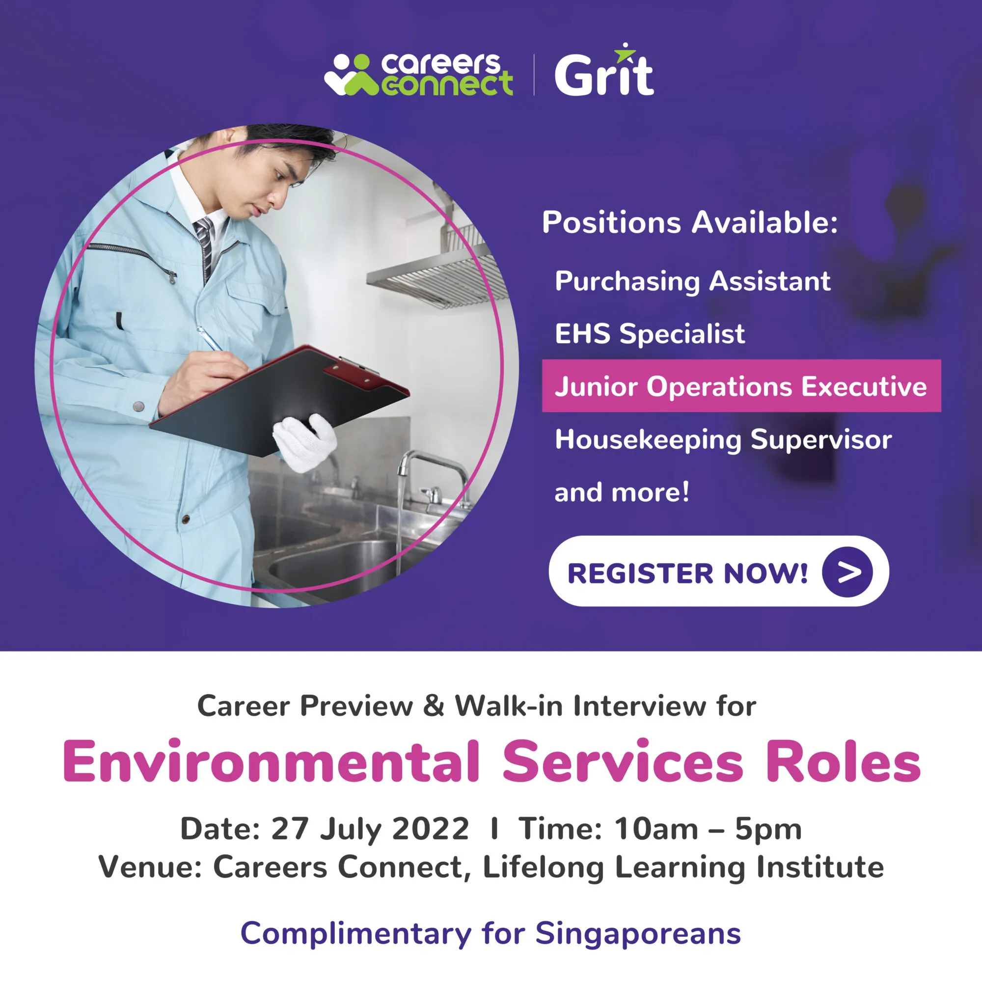 Looking for a rewarding and enriching career? Check out the Career Preview & Walk-in-Interview for Environmental Services Roles to explore exciting opportunities, career conversion programmes and more! Participating employers include: Hua Ying (Singapore) ISS Facility Services Sun City Maintenance TES-AMM (Singapore)