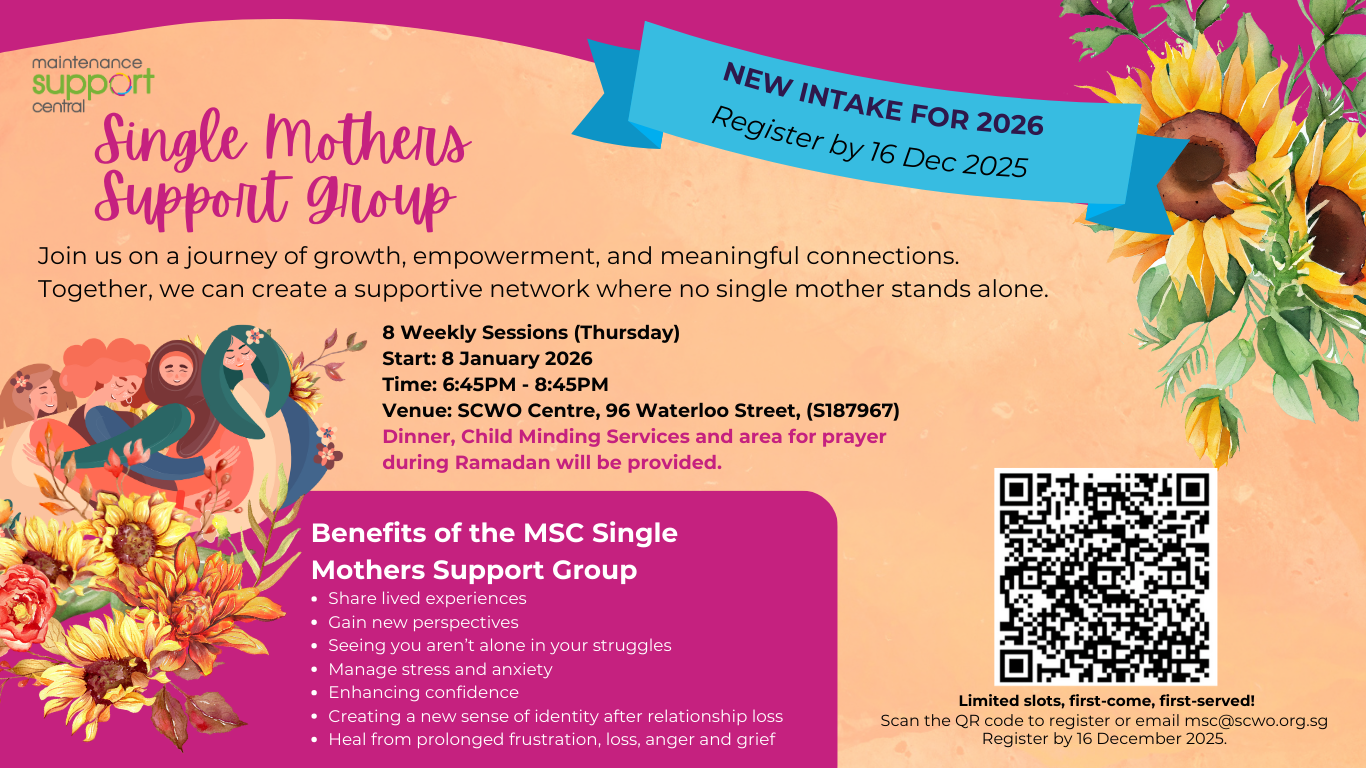 SCWO Centre 96 Waterloo Street, SingaporeJoin the next batch of MSC's Single Mothers Support Group every Thursday starting from 8 Jan 2026, 6.45pm to 8.45pm. The support group offers a safe, non-judgmental space for single mothers to share their experiences, receive emotional support, and build community.